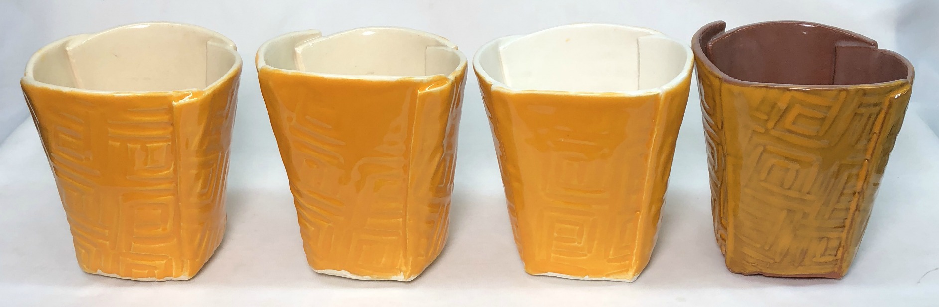 Spectrum 754 (700 clear on insides) on Plainsman Buffstone, L212, L213, L215. Fired at cone 04.